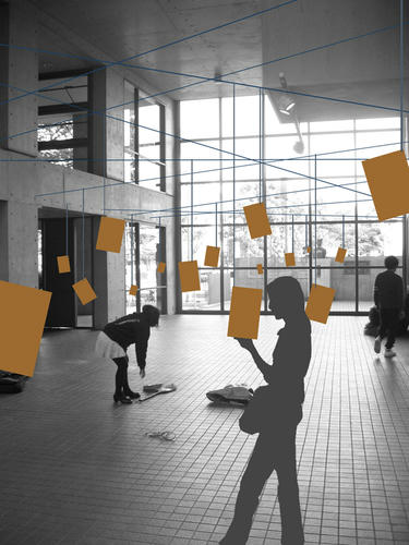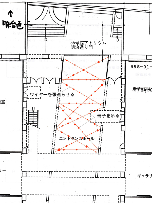 55号館アトリウムにあるコンクリートの柱からワイヤーを張り巡らせる。そこから作品(個人冊子、インデックスなど)を吊り、アトリウムの空間に100冊近い冊子が浮遊するような展示空間を基本計画とする予定である。
