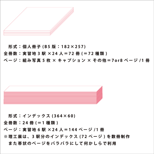 次にインデックス冊子型は、理工展の写真展でも何らかの形で利用しますが、基本的には全実習後の12月に向けて完成する予定です。6駅(全ての実習地)×24人=144ページの冊子を各24部ずつ(皆さんが1冊ずつ持って帰れる)制作します。仮の予定として、理工展では3駅分の冊子を個人冊子のインデックスとして利用するため数冊制作してみます。また、他の利用方法も現在検討中です。